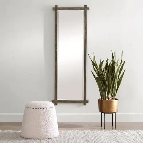 This Abanu Tall Mirror includes a highly antique gold plated frame with ribbed texture, creating a tribal impression. The piece has a generous 1 1/4″ bevel and may be hung horizontal or vertical.