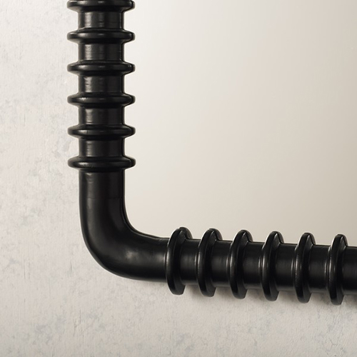 Introducing the Aria Mirror—a sophisticated piece that beautifully blends functionality with artistic design. In a timeless black finish, this mirror features a unique frame meticulously crafted from pinewood, creating a stunning visual contrast and an atmosphere of elegance in any space. The mirror’s distinctive frame is designed to resemble a series of corrugated segments, with deep grooves and ridges that offer a dynamic and textured look. This design mimics the industrial style of corrugated metal pipes while bringing the warmth and organic appeal of wood.