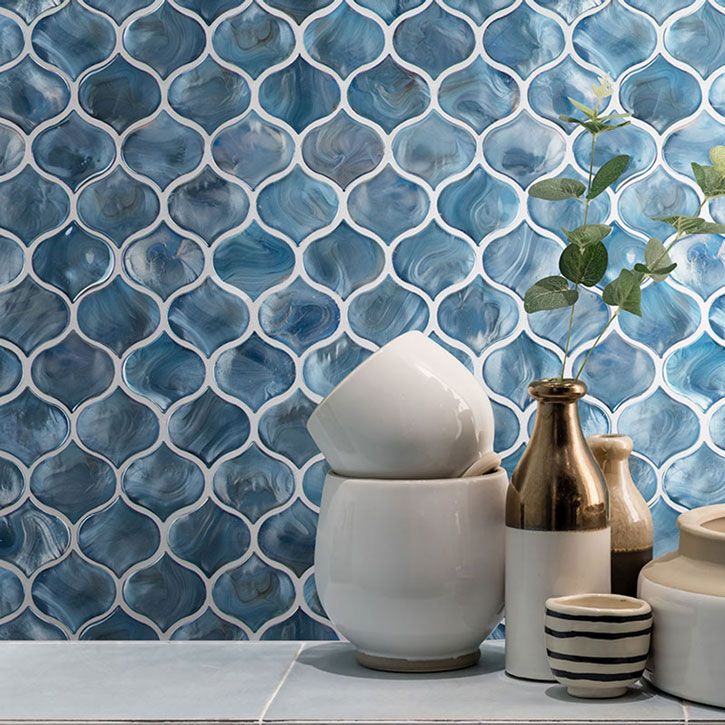 Blue Shimmer Arabesque Tile features an iconic arabesque shape in a swirl of pearl-like ocean blue hues. This gorgeous light-reflecting backsplash tile will turn up the wow factor in any design. Blue Shimmer Arabesque Tile is suitable for residential and light commercial use on backsplashes, vanity walls, shower surrounds, and other vertical applications where a touch of the unexpected is desired. This tile is Greenguard Indoor Air Quality Certified® and comes mounted on mesh-backed sheets for a simplified installation and professional finish.