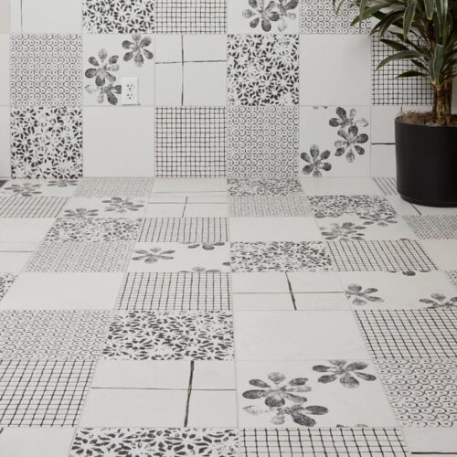 Each tile showcases a distinct pattern—ranging from geometric forms to organic motifs—designed to be mixed and matched. This flexibility allows for compositions that can feel either dynamic and bold or quietly rhythmic, depending on how the designs are arranged. The interplay of matte and glossy finishes adds depth, shifting with the movement of light across the surface.