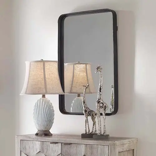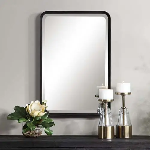 This vanity mirror’s satin black-finished forged metal strap gives it a versatile appearance. The Crofton Black mirror may be hung either vertically or horizontally, and it has a 1 1/4″ bevel.