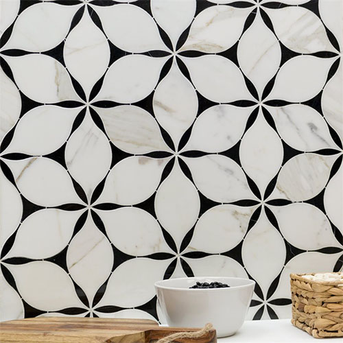 Collection: Ethereal Sheet Coverage: .56 sq. ft. Thickness: 10 mm Material: Nero Marquina & Calacatta