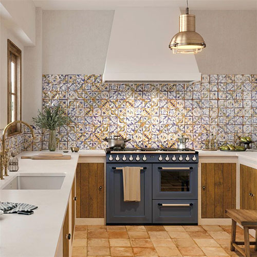 The Kings Campania Amalfi ceramic tile features a blend of blue and white tones with intricate Mediterranean-inspired patterns, bringing a coastal charm to any space. Its durable ceramic design and matte finish make it perfect for high-traffic areas on both walls and floors.