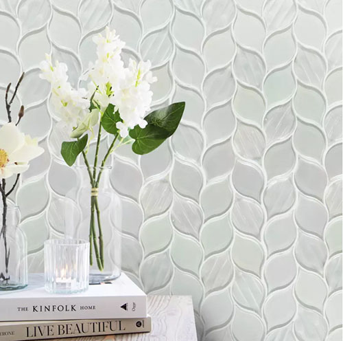 The Laser Cut Iridescent Glass Mosaic with Ascending Vine Leaf Design brings sculptural artistry into interior spaces through a flowing vine motif rendered in luminous, iridescent glass. Laser precision ensures each leaf curves and aligns with crystalline accuracy, forming a rhythmic composition that draws the eye upward and enhances architectural harmony.