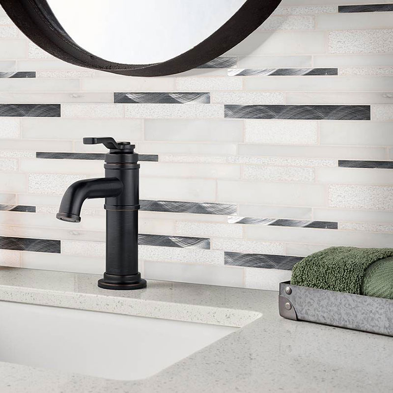 This mosaic tile features various shades of frost white with a complimentary solid gray and speckled gray. This mosaic sheet tile is designed for both residential and commercial wall tile applications.