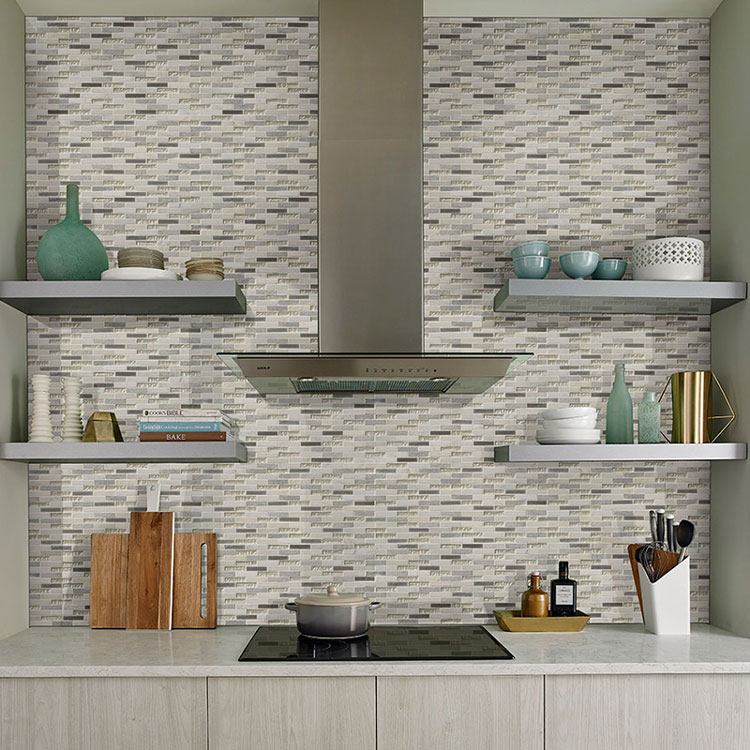 Ocean Crest Glass & Metal tile features an elegant combination of glass, metal, and natural Arabescato Carrara Metal Tile. The soft white and gray tones in this backsplash tile blend in harmony with the natural veins of the marble.