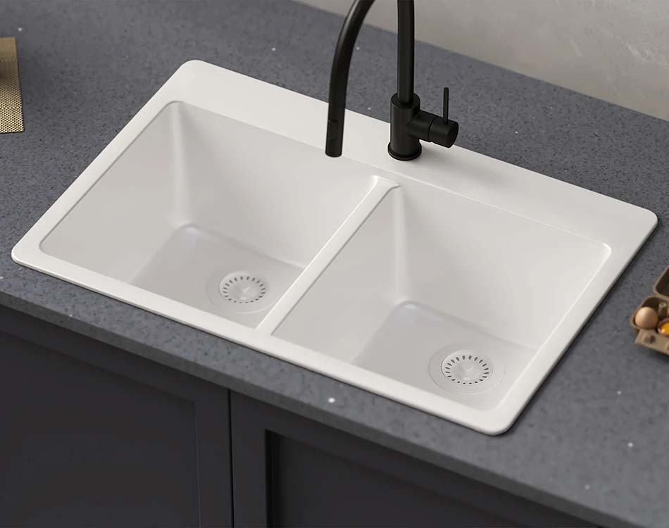 The PL-200 Alpina Granite Composite double bowl sink from the Crystallite Series is a masterpiece of craftsmanship. It is made with 85% natural quartz, which is known for its durability, and a premium acrylic binder to produce a beautiful and sturdy sink. Designed in Germany, these sinks are made with durable, eco-friendly materials that guarantee sustainability and excellence.