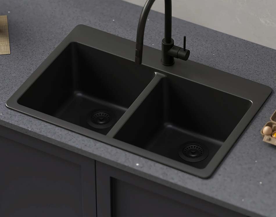 The PL-200 Onyx Granite Composite double bowl sink from the Crystallite Series is a masterpiece of craftsmanship. It is made with 85% natural quartz, which is known for its durability, and a premium acrylic binder to produce a beautiful and sturdy sink. Designed in Germany, these sinks are made with durable, eco-friendly materials that guarantee sustainability and excellence.
