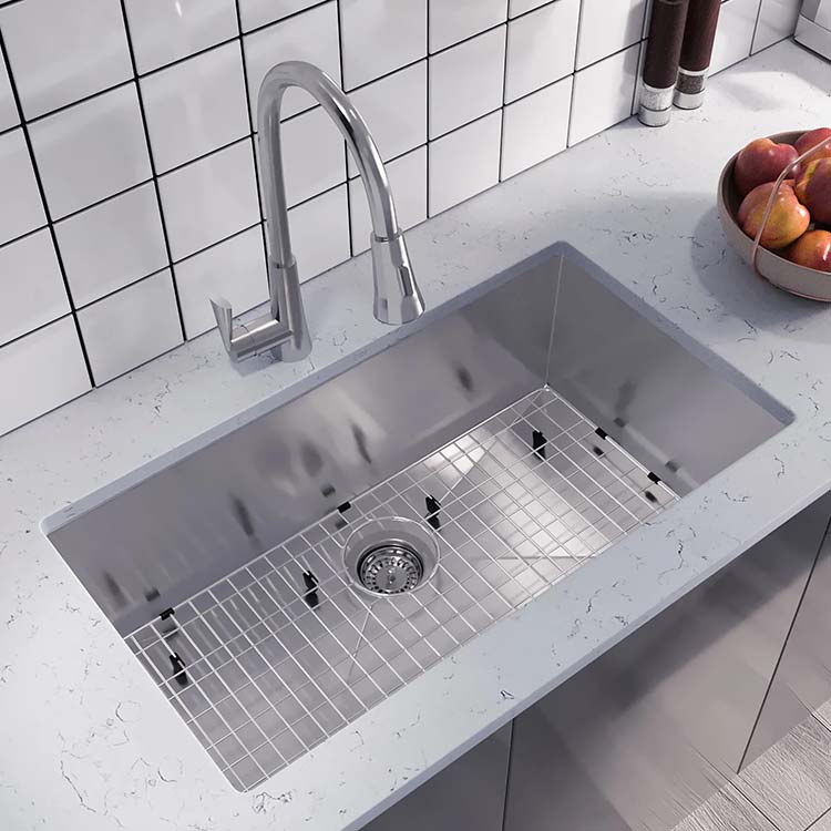 Our 304 stainless steel, which has an 18:10 chromium to nickel ratio, is a great option for both commercial and domestic applications. This modern, fully constructed sink accommodates a variety of tastes and practical requirements with its straight sides, exceptionally deep bowl, and zero or fifteen degree corner radiuses. In addition to improving its visual appeal, its sophisticated satin brushed finish also hides minor dings and guarantees that it will remain shiny even after frequent use. Below the surface, sound deadening pads and our exclusive Protect Coating combine to reduce noise and stop condensation buildup, improving longevity and functionality.