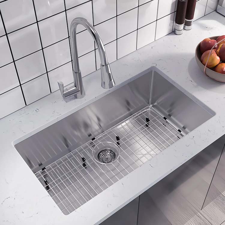 Our 304 stainless steel, which has an 18:10 chromium to nickel ratio, is a great option for both commercial and domestic applications. This modern, fully constructed sink accommodates a variety of tastes and practical requirements with its straight sides, exceptionally deep bowl, and zero or fifteen degree corner radiuses. In addition to improving its visual appeal, its sophisticated satin brushed finish also hides minor dings and guarantees that it will remain shiny even after frequent use. Below the surface, sound deadening pads and our exclusive Protect Coating combine to reduce noise and stop condensation buildup, improving longevity and functionality.