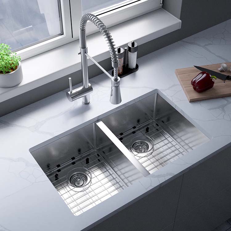 Our 304 stainless steel, which has an 18:10 chromium to nickel ratio, is a great option for both commercial and domestic applications. This modern, fully constructed sink accommodates a variety of tastes and practical requirements with its straight sides, exceptionally deep bowl, and zero or fifteen degree corner radiuses. In addition to improving its visual appeal, its sophisticated satin brushed finish also hides minor dings and guarantees that it will remain shiny even after frequent use. Below the surface, sound deadening pads and our exclusive Protect Coating combine to reduce noise and stop condensation buildup, improving longevity and functionality.