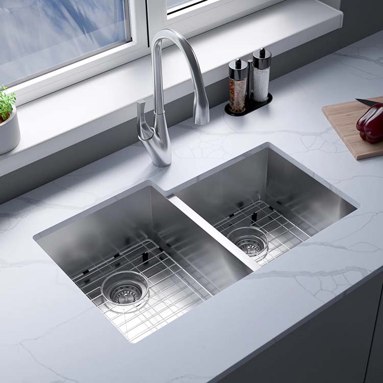 Our 304 stainless steel, which has an 18:10 chromium to nickel ratio, is a great option for both commercial and domestic applications. This modern, fully constructed sink accommodates a variety of tastes and practical requirements with its straight sides, exceptionally deep bowl, and zero or fifteen degree corner radiuses. In addition to improving its visual appeal, its sophisticated satin brushed finish also hides minor dings and guarantees that it will remain shiny even after frequent use. Below the surface, sound deadening pads and our exclusive Protect Coating combine to reduce noise and stop condensation buildup, improving longevity and functionality.