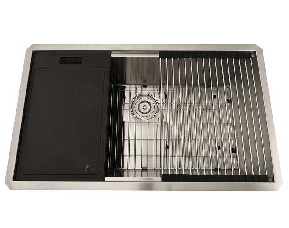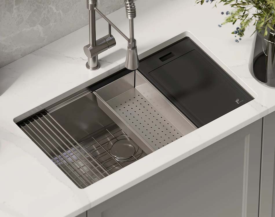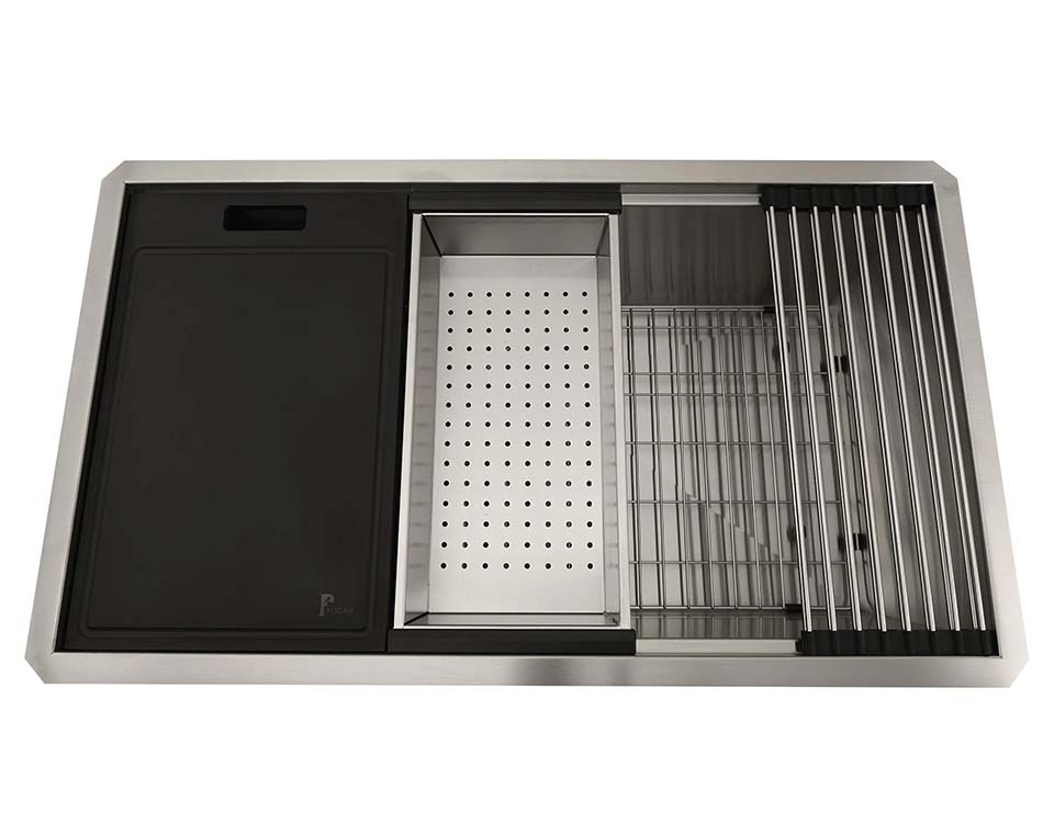 The Performance Series PL-WS3319 R0 16g stainless steel workstation sinks are the perfect example of how elegant style and useful functionality can coexist harmoniously. These sinks are a highly acclaimed addition to many homes because of its innovative design, which transforms kitchen spaces and elegantly integrates all accessories, including a bottom grid, cutting board, colander, folding rack, basket strainer, and drain cover.