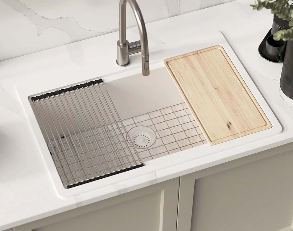 The Crystallite Series PL-WS400 Alpina Granite Composite workstation sinks are the perfect example of how elegant style and useful utility can coexist harmoniously. Developed to transform kitchen areas, these sinks smoothly integrate all accessories, such as a drying rack, cutting board, and bottom grid, and have received broad praise as a desired addition for many homes. 85% genuine quartz, granite’s hardest component, is used in its construction, together with a high-end acrylic binder for remarkable durability.