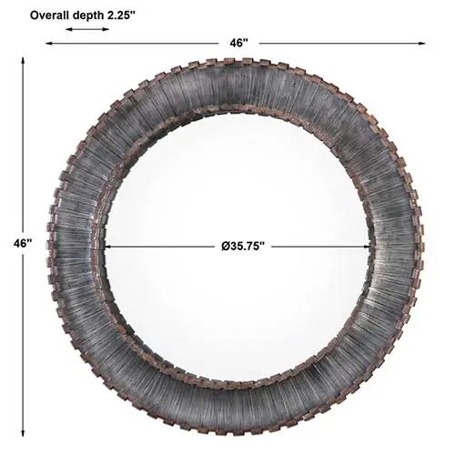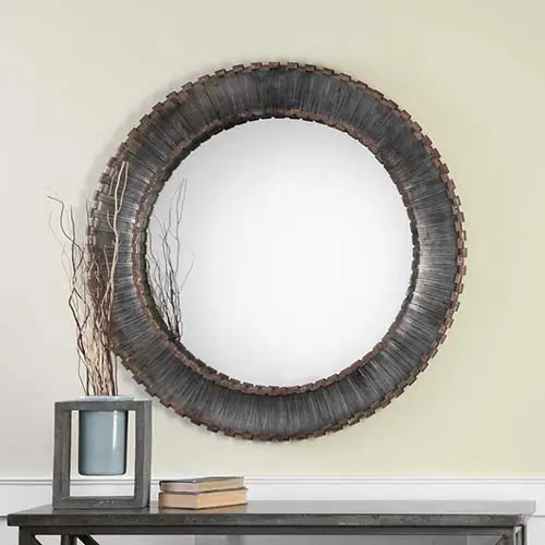 This frame is made from hand-forged metal strips that are twisted at both ends and vary in length. The shiny silver finish with rust brown borders and black dry brushing. The bevel on the Tanaina Round mirror is a substantial 1 1/4″.